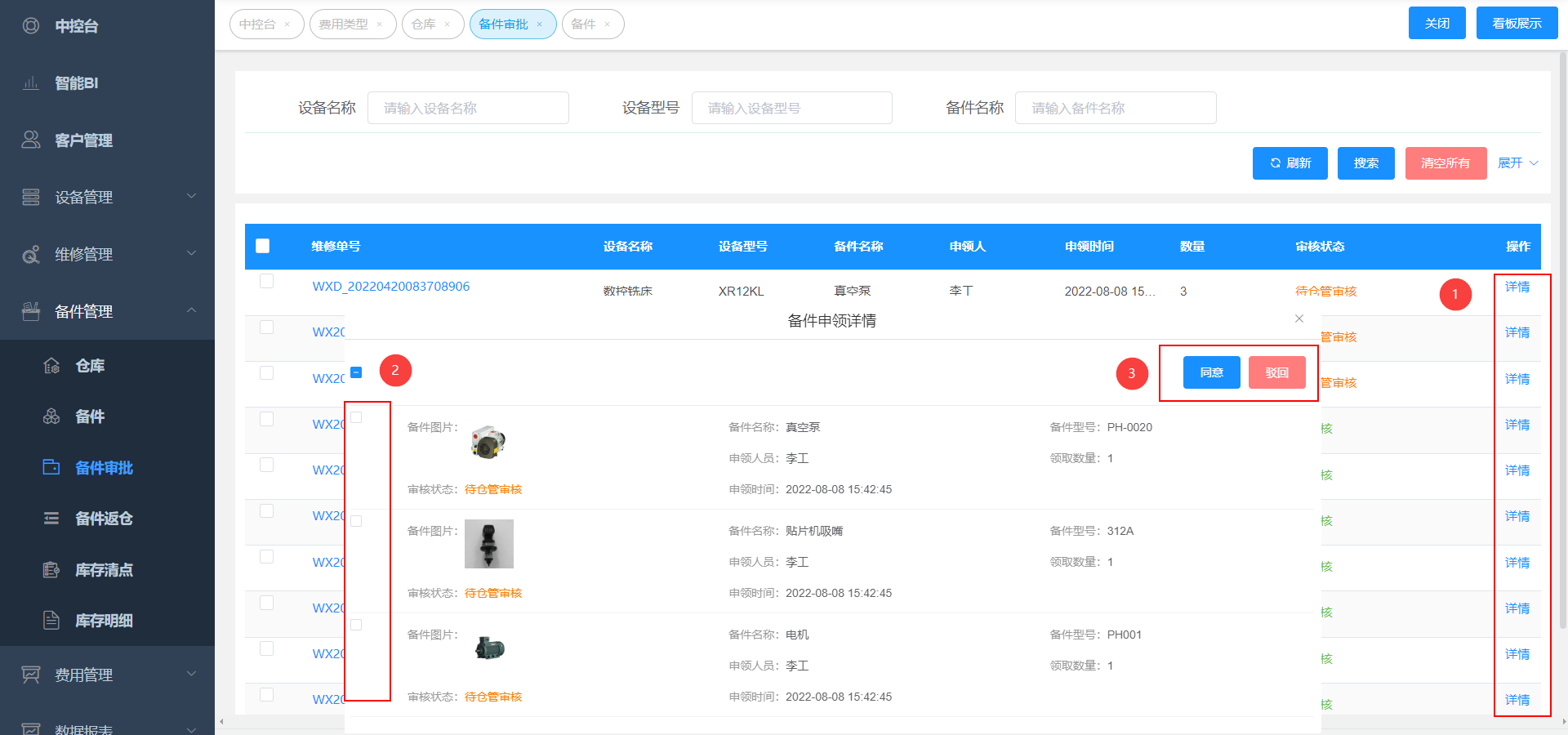 仓管人员点击同意,管理员点击同意,备件申领成功。